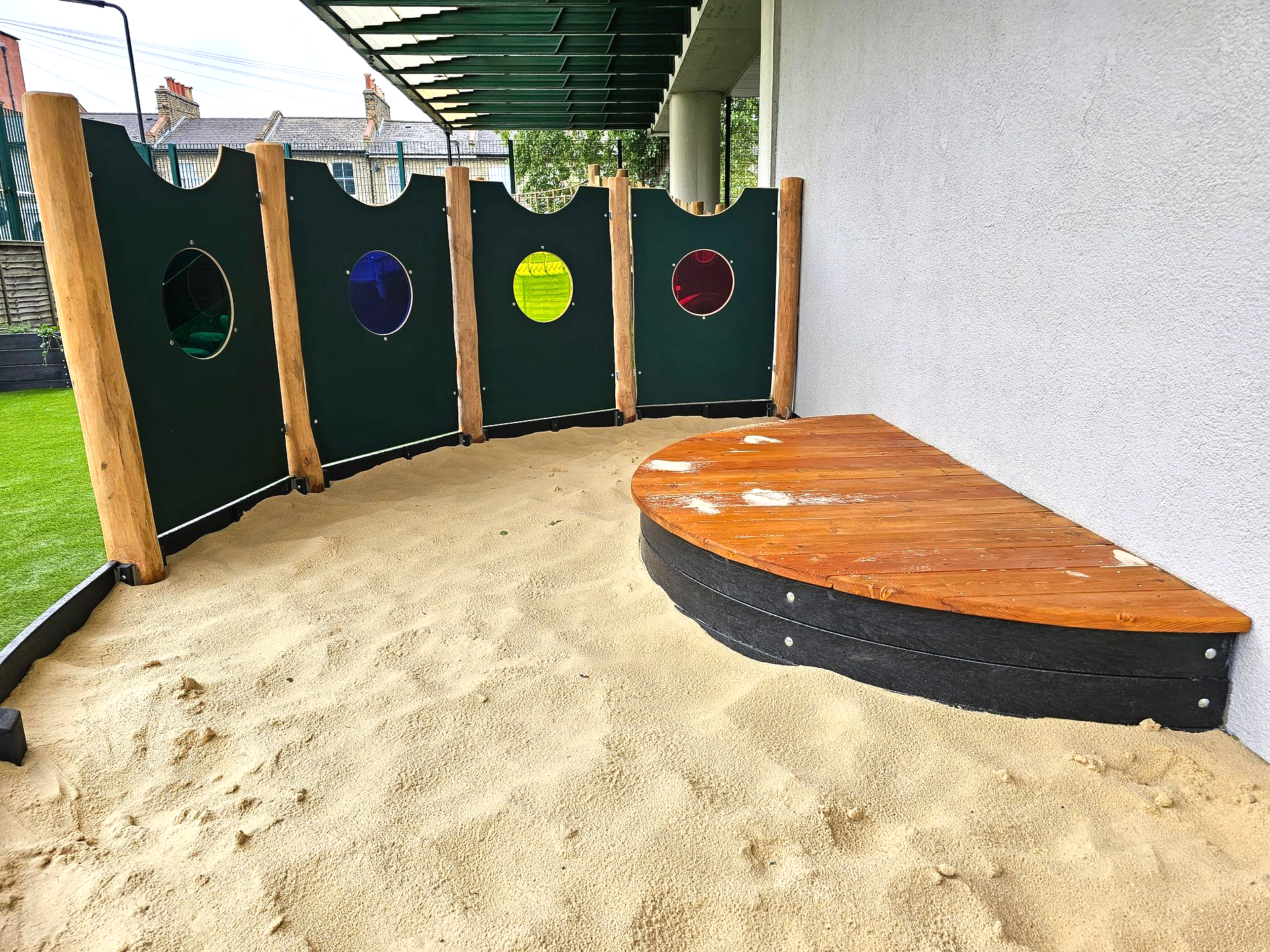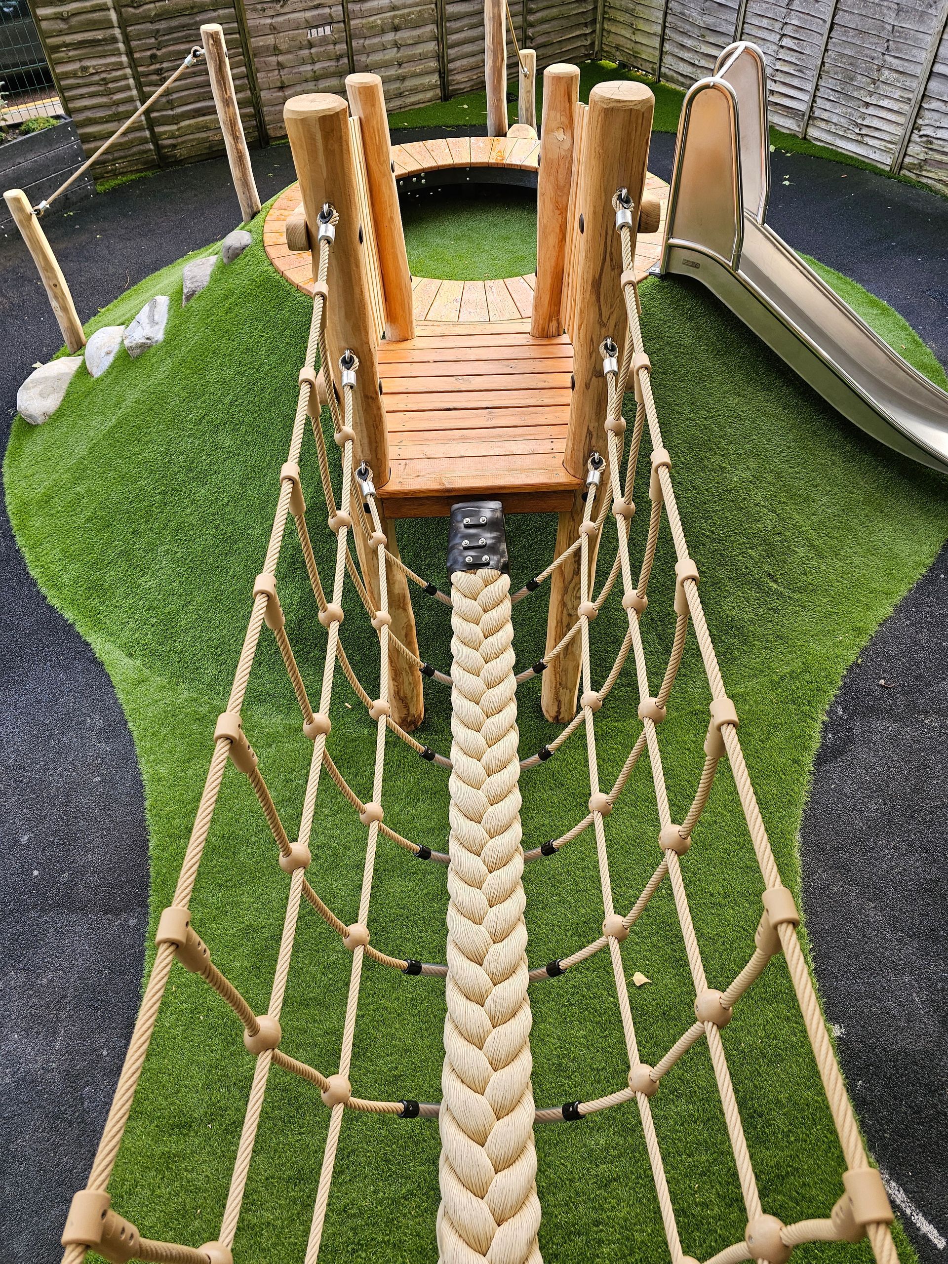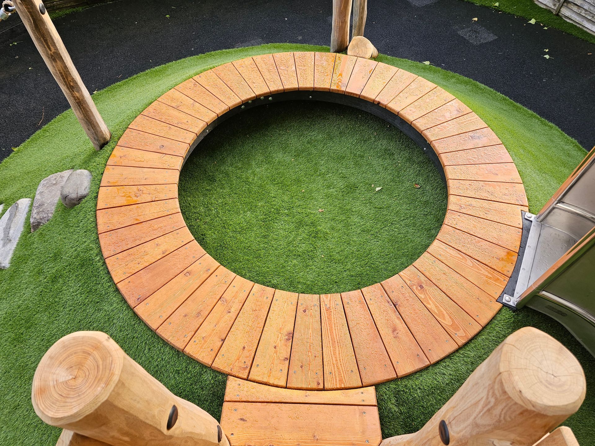This space was designed for 0-5 year olds – combining challenging physical play elements with contrasting areas for quieter forms of play. Twin play mounds include a rope bridge, crawl tunnel, sunken volcano crater rim, embankment slide & rock steps - surrounded by a figure-8 bike track. Other features include a sheltered area for sand play (incl. windbreak panels), raised sensory planting, curved seating, play kitchen, new turf & bonded-rubber surfacing - plus open areas for setting up temporary play equipment. And we have recently added a bespoke play hut with a surrounding wooden deck
