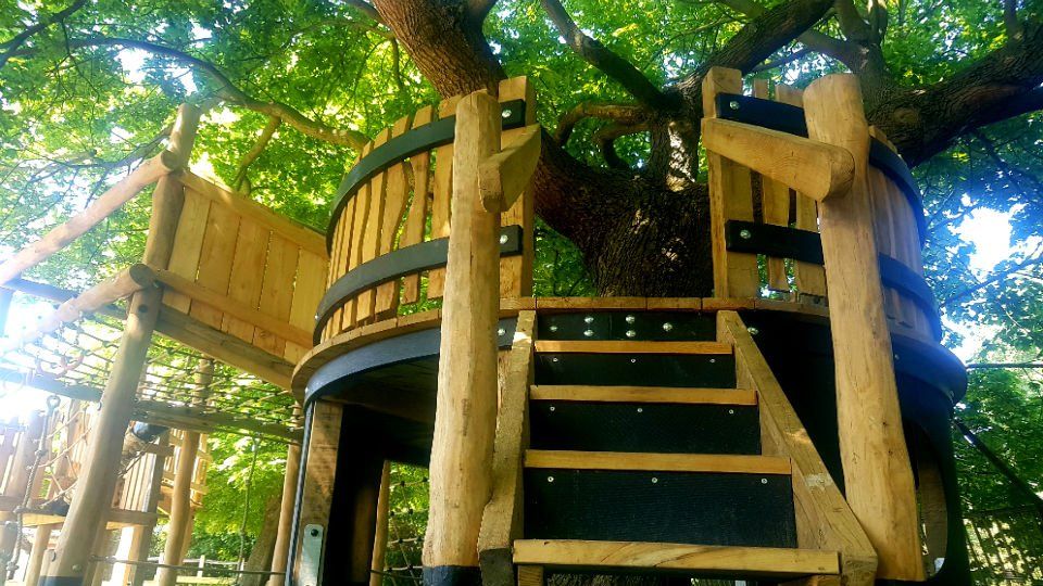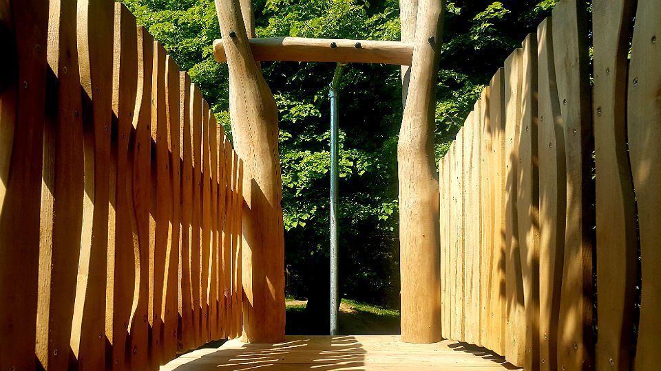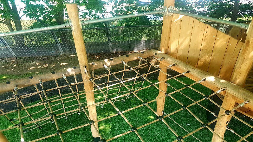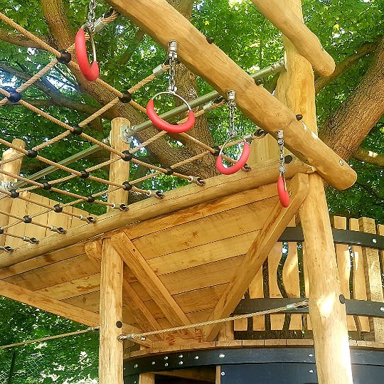 The design combines a range of challenging routes using nets, traverse ropes, hammock, bridges, a tree house and den, fire pole slide and monkey rings. The main structure is surrounded by a bike track with rubber speed bumps. All timber elements are built from highly durable hardwood Robinia, while plastic elements are 100% recycled. All nets and ropes are nylon wound with a steel core. The surfacing comprises artificial turf layed over safety padding.