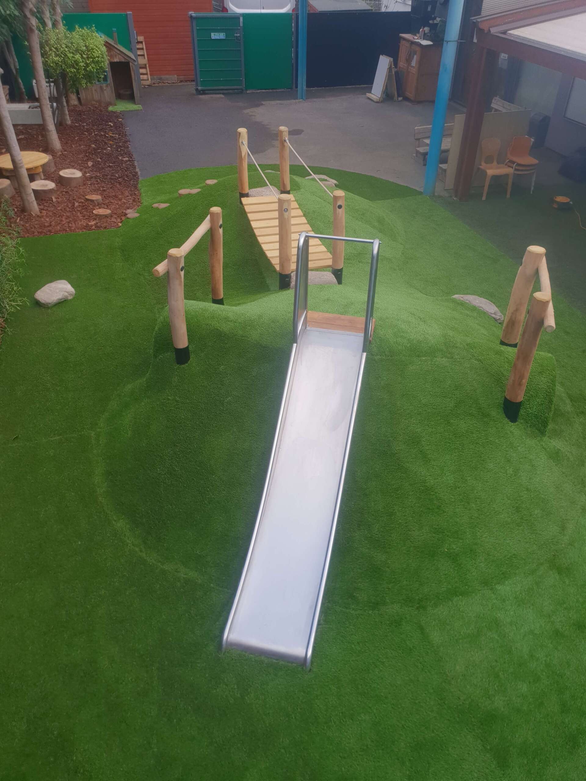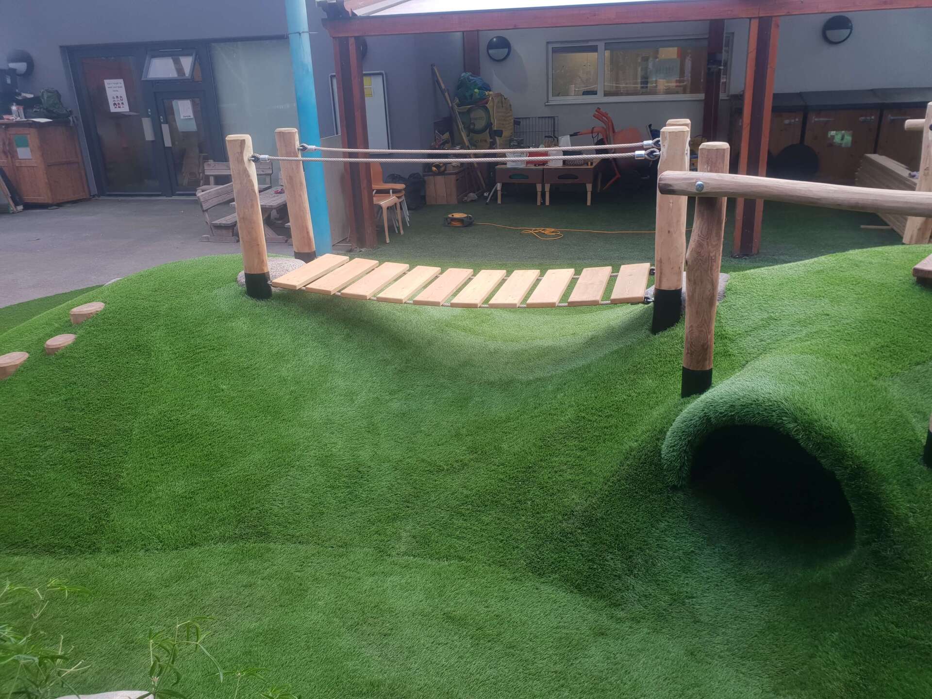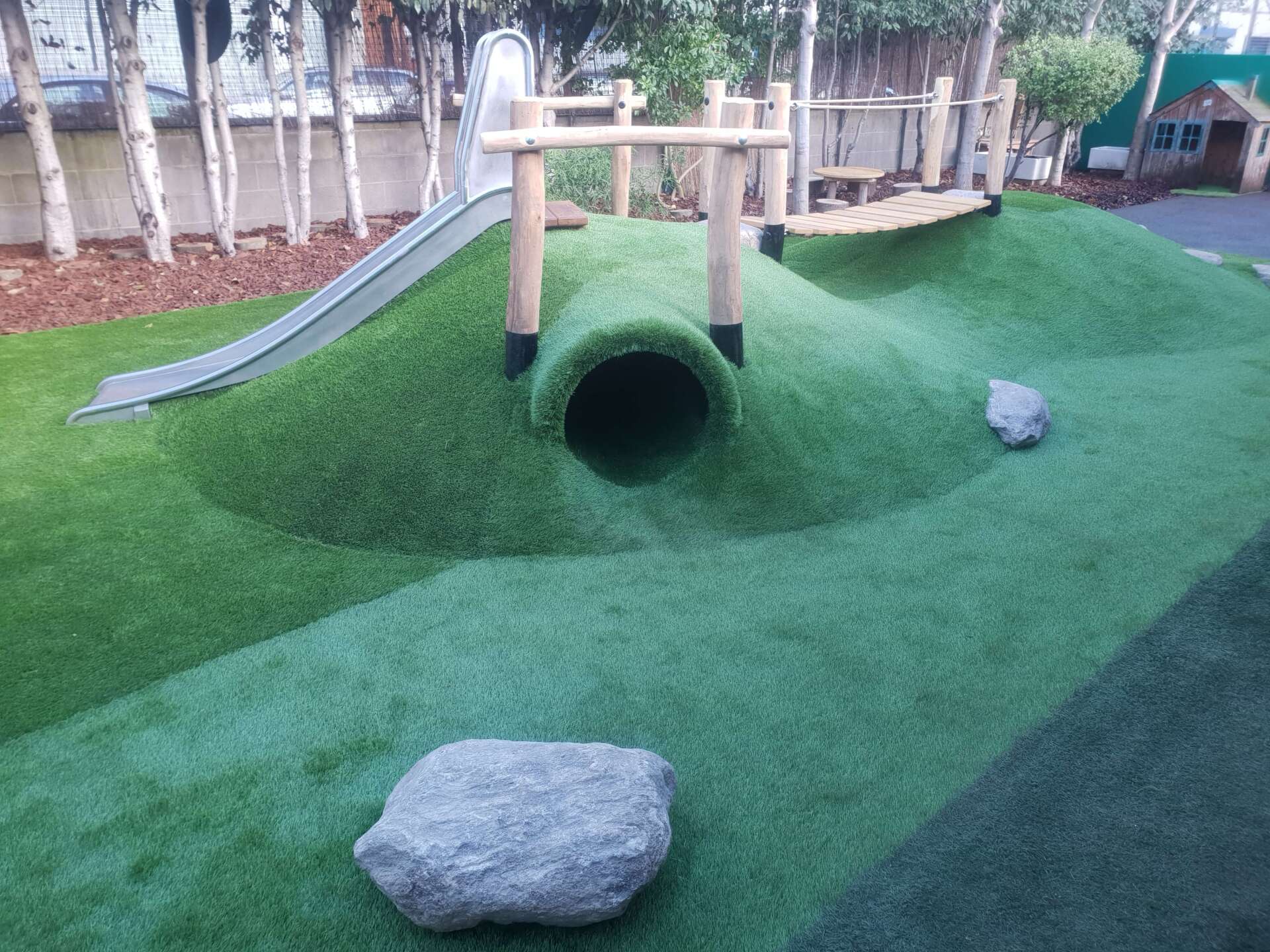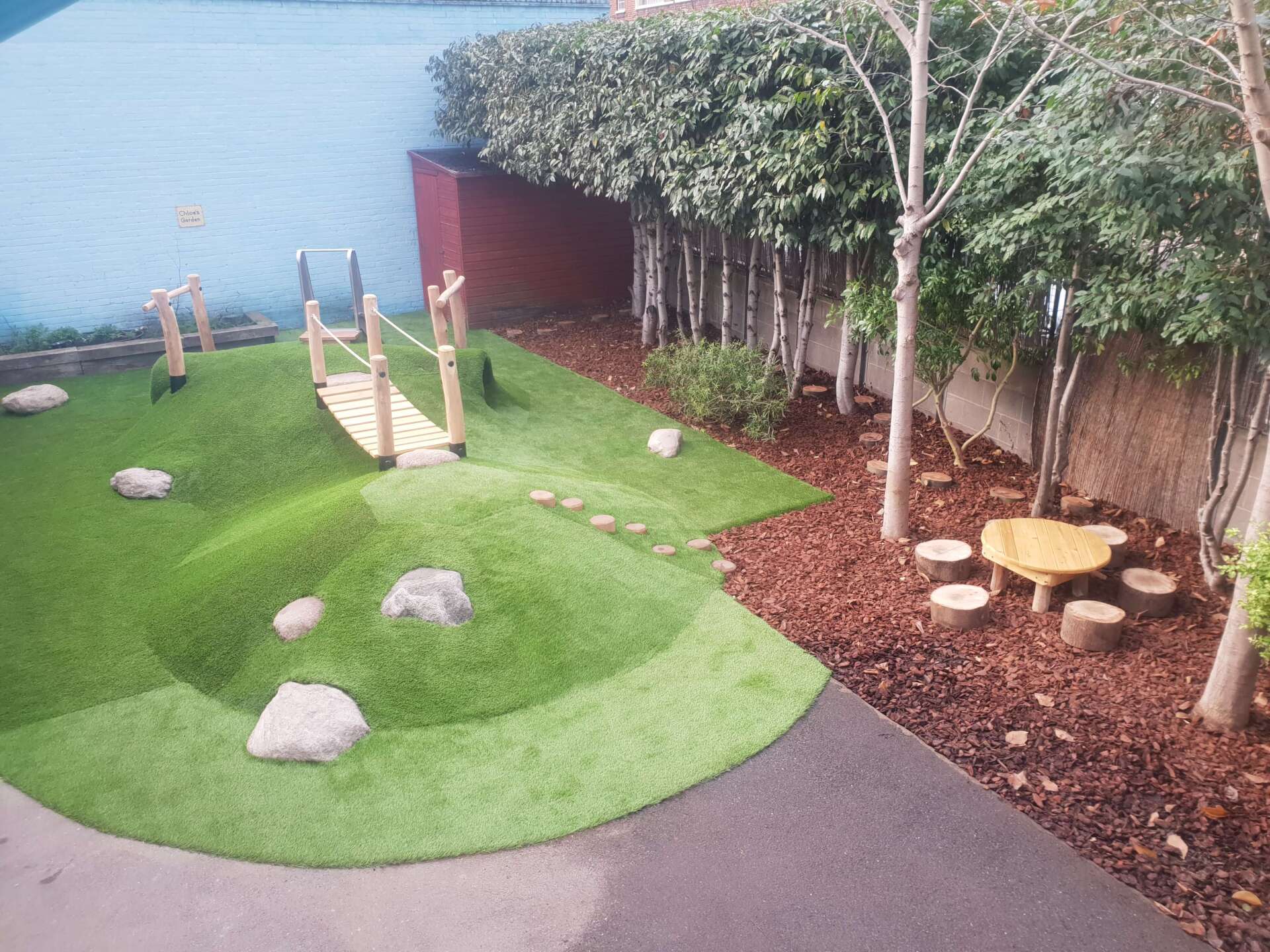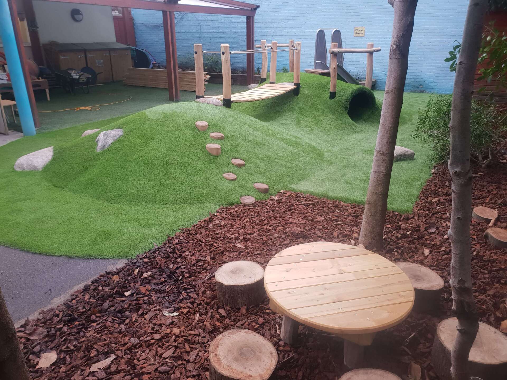 The playscape was designed to encourage babies and toddlers to gain confidence as they reach new milestones – such as learning to walk, crawl or balance by themselves. We removed a small and rotting play structure, which was set within a large area of bonded rubber surfacing (EPDM). We combined a tunnel, slide and a custom-built swing bridge connecting twin play mounds. Natural log steps provide a more challenging route up the hill and set river boulders offer places for clambering or sitting. The tunnel ends were each fitted with easy-use removable circular doors, keeping out foxes and cats after hours. The playground was independently inspected with a PII report to certify how we met all relevant BSEN guidelines. Other improvements were made to the existing garden area, including a small table with log seats. We also included privacy & security screening, with coloured Birch ply panels being fixed to cover an existing fence and gate.