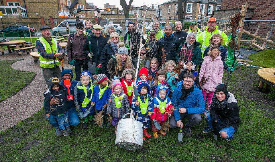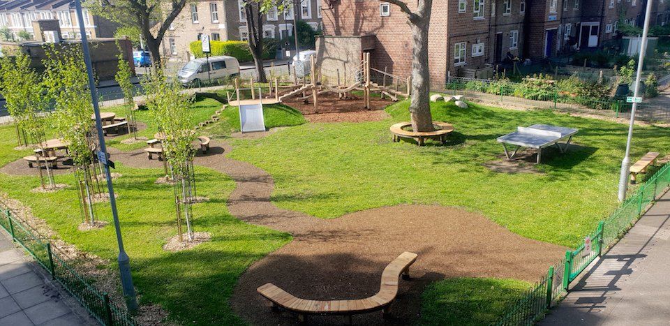We designed and built a natural play area comprising mounds, boulders, jungle bridge, a slide, pull-up ropes, a balance beam maze with a bamboo jungle, and a fallen oak tree climbing log – all built to comply with relevant BSEN Health & Safety guidelines. The garden includes bench seating and a circular tree seat, plus bespoke picnic tables. We also installed a bonded-rubber chip path and a table tennis area. The whole garden has been encircled by wildlife-friendly hedging, interplanted with large specimen trees and several varieties of cobnuts and hazels for shade and all year interest. The project was funded and supported by The London Marathon Trust, GLA Greener Cities Fund, The National Lottery Awards for All, L.B.Hackney, the on-site Kindergarden, and the Tenants & Residents Association of Morland Estate.