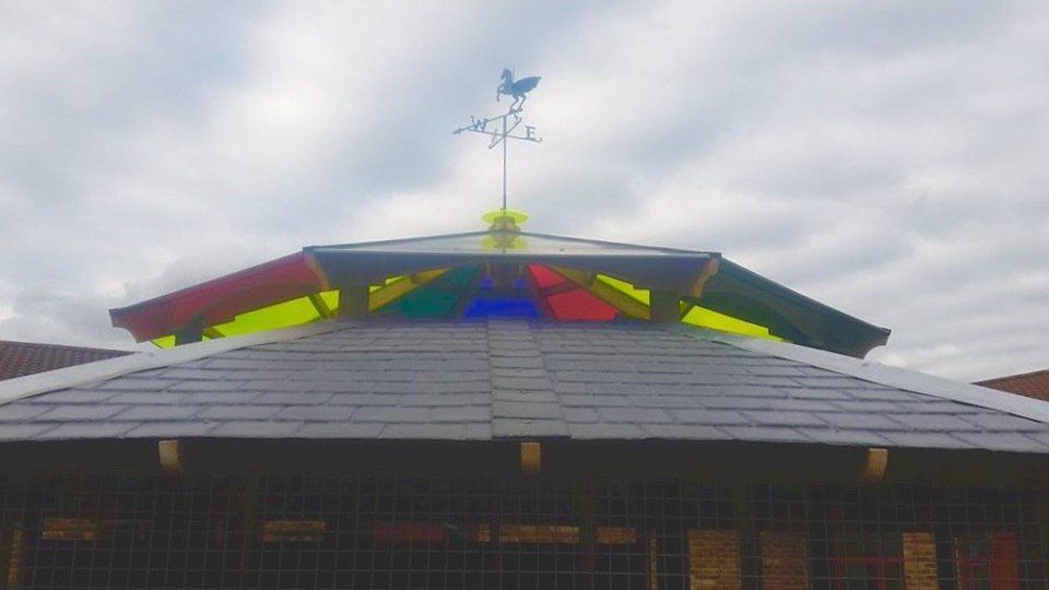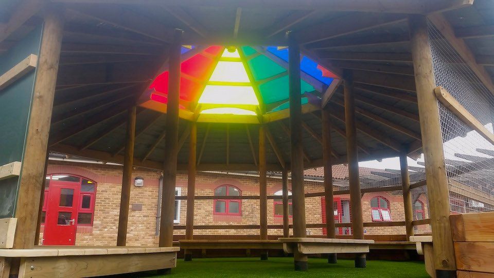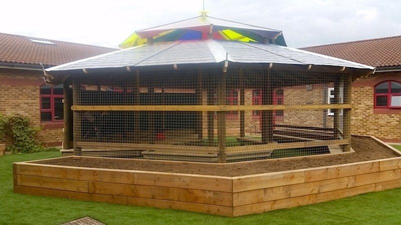 We designed a large, octagonal post-and-beam roundhouse with a built-in stage and bench seating for up to 30 pupils at Woodend Primary Academy. A comfortable, easy-care, artificial turf carpeted floor provides informal seating for even larger groups, and the the two-tiered, lantern roof gives shelter in all weathers, bathing the interior in warm, colourful light. Outside, large sturdy timber vegetable beds flank the south-facing perimeter giving plenty of room for fruit and veg, and the growing of climbing beans and peas up the mesh panelling of the walls.